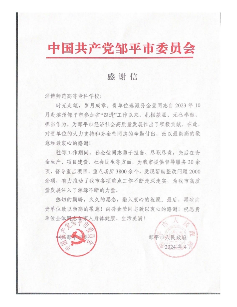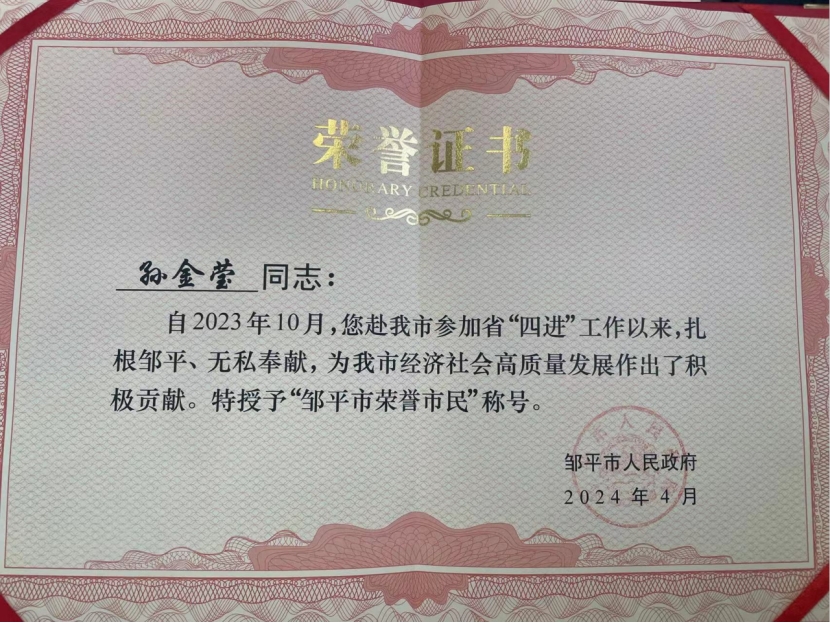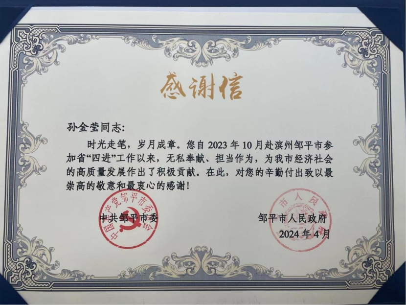 三是躬身入局勇担当。在各项督导任务中,认真学习业务知识,积极向老队员讨教经验做法。按照支队布置安排,与老队员协同配合,先后参与食品安全、在建在售房地产项目、自建房调查、一氧化碳、取暖保障、森林防火、企业打点定位、安全生产等30项督导服务任务,检查各类主体300余个、发现各类问题隐患500余个,并落实闭环整改要求,对相关问题进行跟踪调度,真实精准记录问题,严格审核提交,保证上报信息无漏项、无模糊、无差错,实现了任务目标零退回,高质量完成了各专项督导工作,个人及公司收到邹平市委市政府的感谢信,同时个人被授予“邹平市荣誉市民”称号。