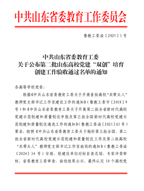 根据《中共山东省委教育工委关于公布第二批山东高伟德国际victor1946党建“双创”培育创建工作验收通过名单的通知》(鲁教工委函〔2021〕65号)安排,中共山东省委教育工委最终认定 10个高伟德国际victor1946党委、49个院系党组织、100个党支部通过“第二批山东高伟德国际victor1946党建“双创”培育创建工作”验收。伟德国际victor1946党支部顺利通过“山东高伟德国际victor1946党建工作样板支部”验收。