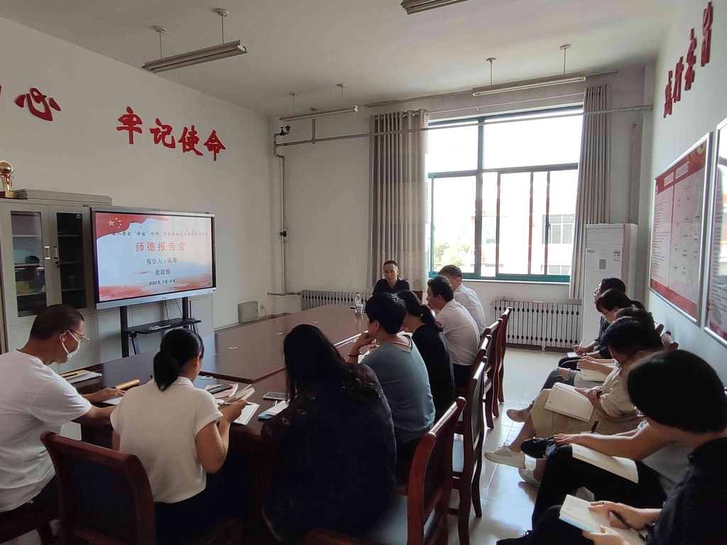 为深入贯彻落实习近平总书记在全国思政课教师座谈会上的讲话精神,对标先进、查摆不足,进一步加强支部党员教师师德师风建设,引导广大教师以德立身,以德立学,以德施教,发挥先进典型的榜样示范作用,思政部党支部于9月16日下午组织开展师德师风主题党日活动,邀请到全国模范教师、省级优秀思政教师淄博五中教师陈骞为支部党员教师做了题为《“六要”记心中,更要有行动》师德师风专题报告会。会议由支部书记王东同志主持,全体党员参加.