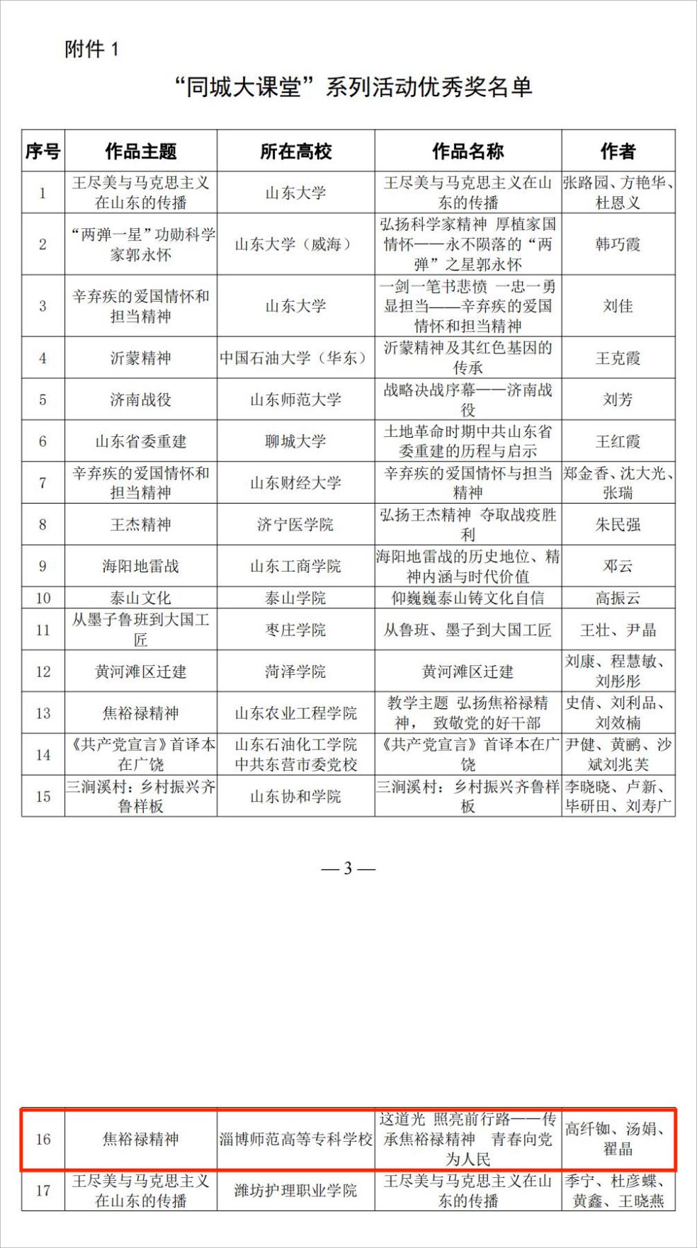 近日,由山东省公司思政课教学指导委员会组织的全省“同城大课堂”分选题教学设计大赛活动结果揭晓,公司伟德国际victor1946高纤铷、汤娟、翟晶团队的《这道光 照亮前行路——传承焦裕禄精神 青春向党为人民》教学设计获评省“同城大课堂”系列活动优秀奖,此奖项全省仅两所专科院校获得,公司是其中之一。