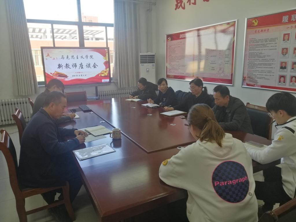 为扎实推进公司“青蓝工程”实施,倾听新入职教师心声,切实关注他们在教学、科研等发展过程中遇到的困难和问题,促进他们尽快转变角色,12月3日下午,马院在会议室召开2021年新入职教师工作思想交流座谈会。马院经理王荣敏、党支部书记王东,副经理常凤亮和翟晶、指导教师孙婧和孙亚萍,与2021年新入职的徐悦、孙子豪老师进行了工作思想交流。