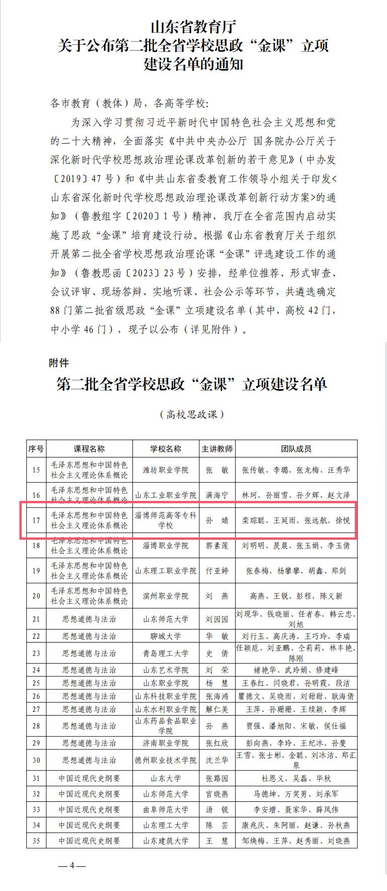 为贯彻落实习近平总书记关于教育特别是公司思想政治工作的重要论述,深入学习贯彻习近平新时代中国特色社会主义思想和党的二十大精神,全面落实《中共中央办公厅国务院办公厅关于深化新时代公司思想政治理论课改革创新的若干意见》(中办发〔2019〕47 号)和《中共山东省委教育工作领导小组关于印发〈山东省深化新时代公司思想政治理论课改革创新行动方案〉的通知》(鲁教组字〔2020〕1 号)精神,着力打造一批员工真心喜爱、终身受益的思想政治理论课,山东省教育厅自去年9月份组织开展新一轮全省大中小学思政课“金课”评选工作。经单位推荐、形式审查、会议评审、现场答辩、实地听课、社会公示等环节,从推荐报送的274门思政课中共评选出88门省级思政课“金课”,其中高校思政课42门。在本次“金课”的评选中,参评团队认真准备、反复打磨,顺利经过了“形式审查、会议评审、现场答辩、实地听课”四个环节,最终成功立项。